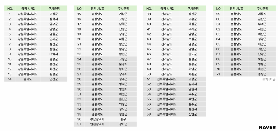 참고로 200만 원 패키지 71개 선거구는 아래와 같으며 해당 선거구는 500만 원 패키지 구매가 어렵습니다.