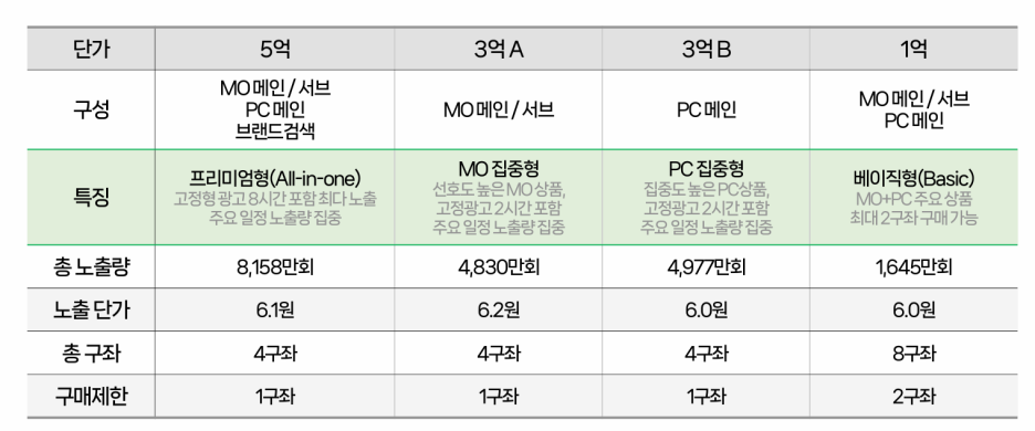 5억 패키지와 다른 점은 타임보드/롤링보드 지면과 브랜드검색이 빠졌습니다.