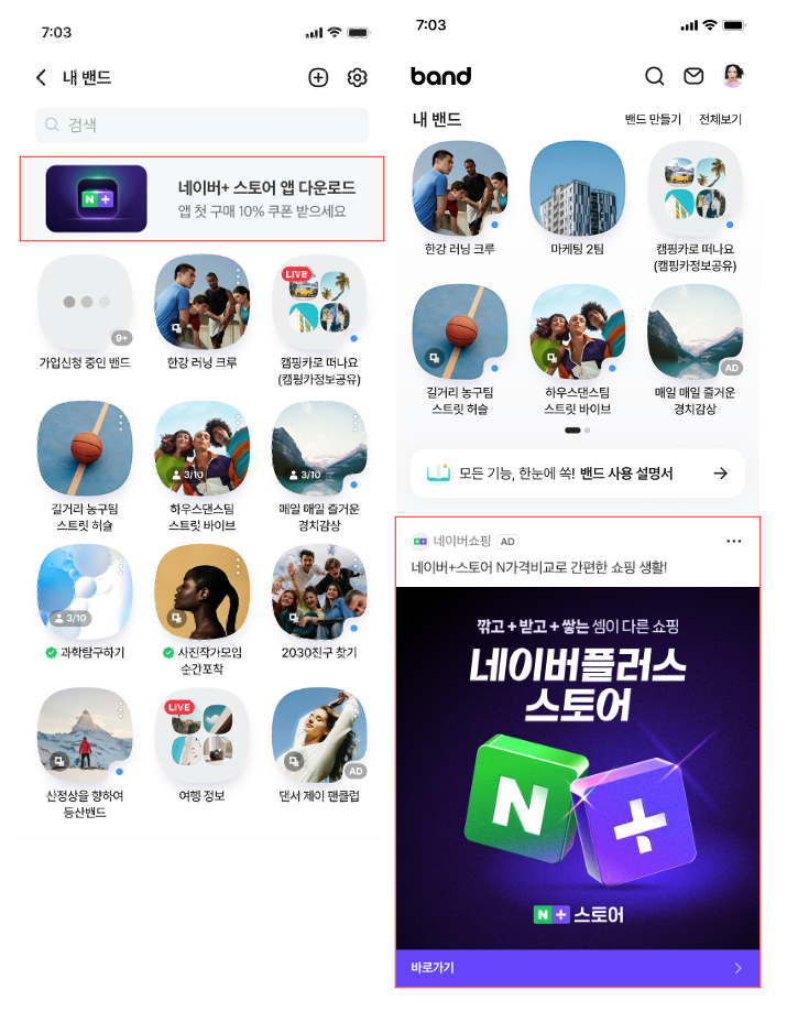 ■ 노출 경로 변경 안내 1. 게재위치 : 네이버+ > 스마트채널 - 기존 : 밴드 APP > 새소식, 미션, 소모임 / 밴드 APP> 내 밴드 - 변경 : 밴드 APP > 전체보기, 미션, 소모임 2. 게재위치 : 네이버+ > 피드 - 기존 : 밴드 APP > 새글 피드 - 변경 : 밴드APP > 홈피드