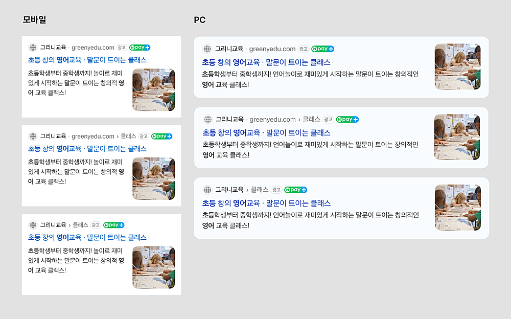 ■ 테스트 내용 * 사이트 이동 경로란? 광고 클릭 시, 사용자가 이동하게 되는 웹사이트의 세부 정보입니다.(세부 카테고리, 하위 페이지 등) - 표시 URL 또는 사이트 이름 뒤에 '>' 기호로 구분된 이동 경로가 노출됩니다. - 표시 URL에 이미 경로가 포함된 경우에는, 도메인만 표시됩니다. (예: 표시 URL이 map.naver.com/p/~ 인 경우, 'map.naver.com'만 노출) - 표시 URL, 네이버페이/네이버 아이디로 로그인 등 아이콘이 미노출될 수 있습니다.