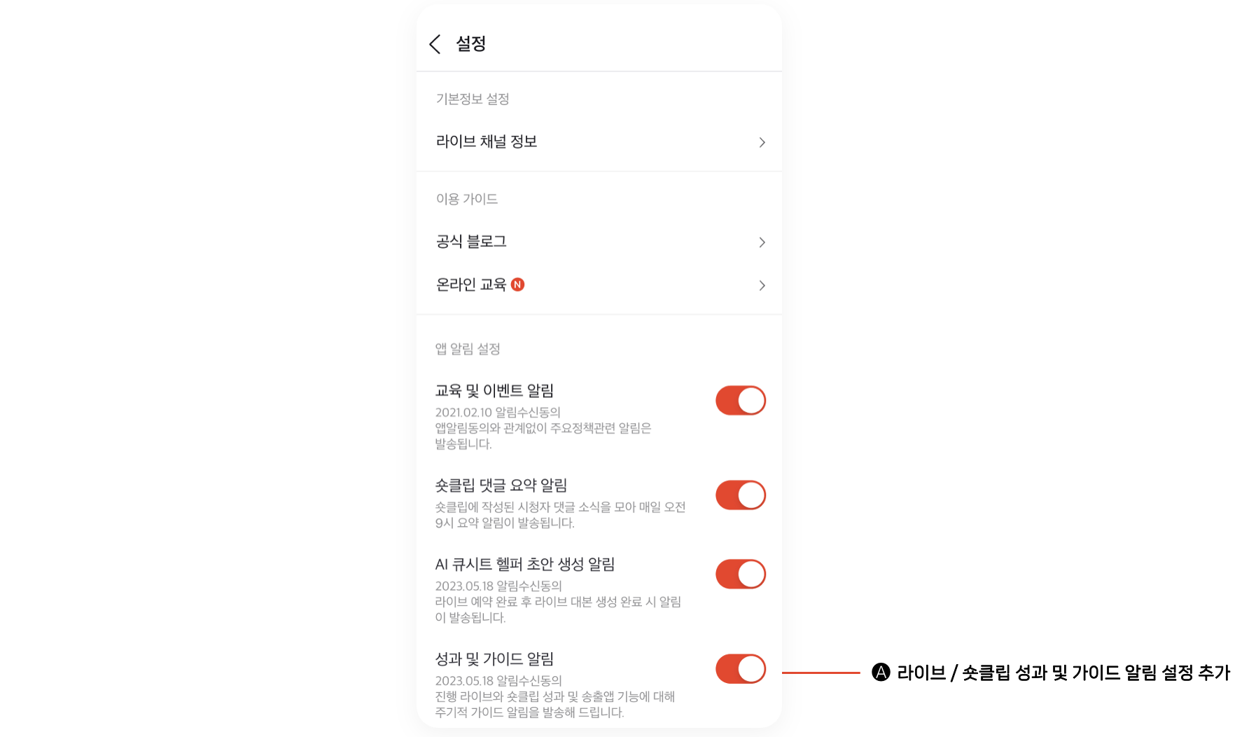 안녕하세요. 1. 판매자를 위한 공지 및 교육 콘텐츠로 쉽게 접근 할 수 있도록 교육링크 상시 노출됩니다. 2. 채널명 / 알림받기 수를 확인할 수 있습니다. 클릭시 지난 라이브 보기 목록으로 이동합니다. 3. 알림 / 설정메뉴 위치가 조정되었습니다. 4. 쇼링라이브 활동 내역 확인할 수 있습니다. 5. 채널의 쇼핑라이브 콘텐츠 거래액 추이 그래프 이전 주 일간 거래액 추이 그래프를 확인할 수 있습니다. 6. 공지사항 목록이 확대되었습니다. 7. 라이브 / 숏클립 주요 과업버튼의 위치는 기존과 같습니다.