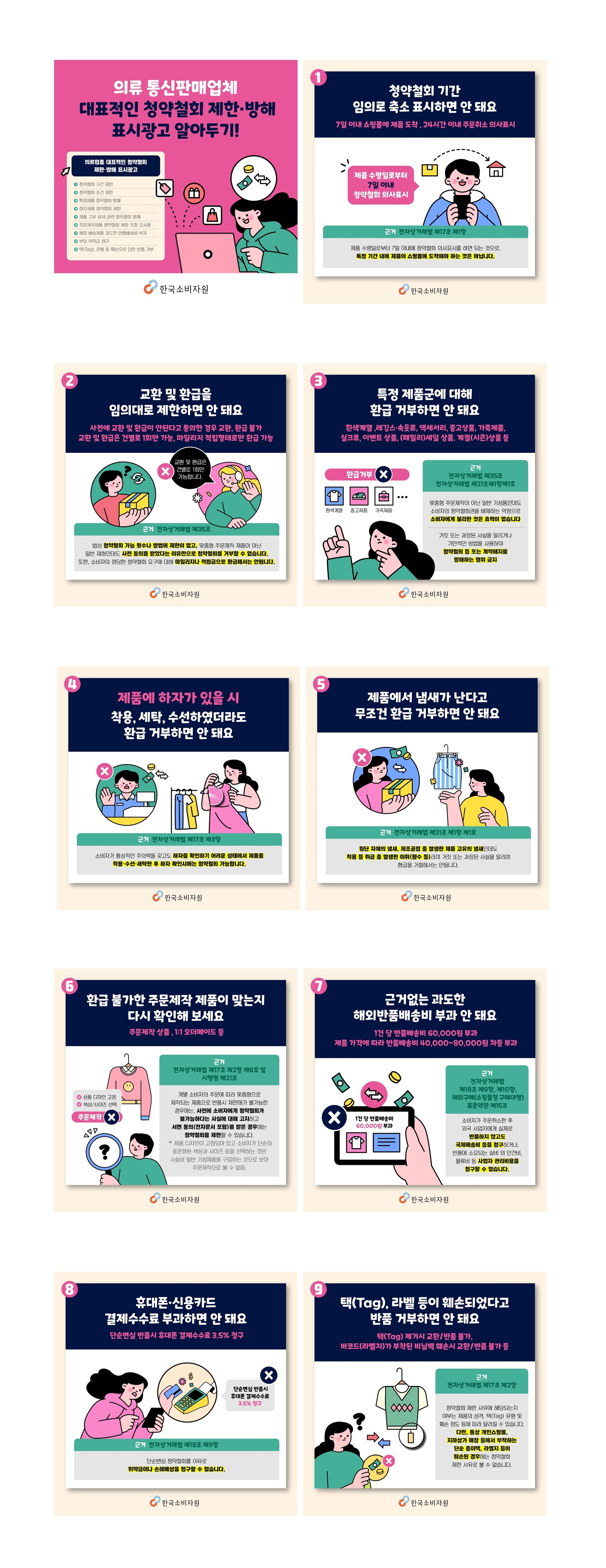 안녕하세요. 의류 업종 통신판매업자의 대표적인 청약철회 제한방해 표시 광고를 쉽게 알 수 있도록 한국소비자원에서 아래와 같은 카드뉴스를 제작하여 배포하였으니 의류 업종 판매자분들은 카드뉴스 내용 참고하시어 판매 활동 해주시길 바랍니다.