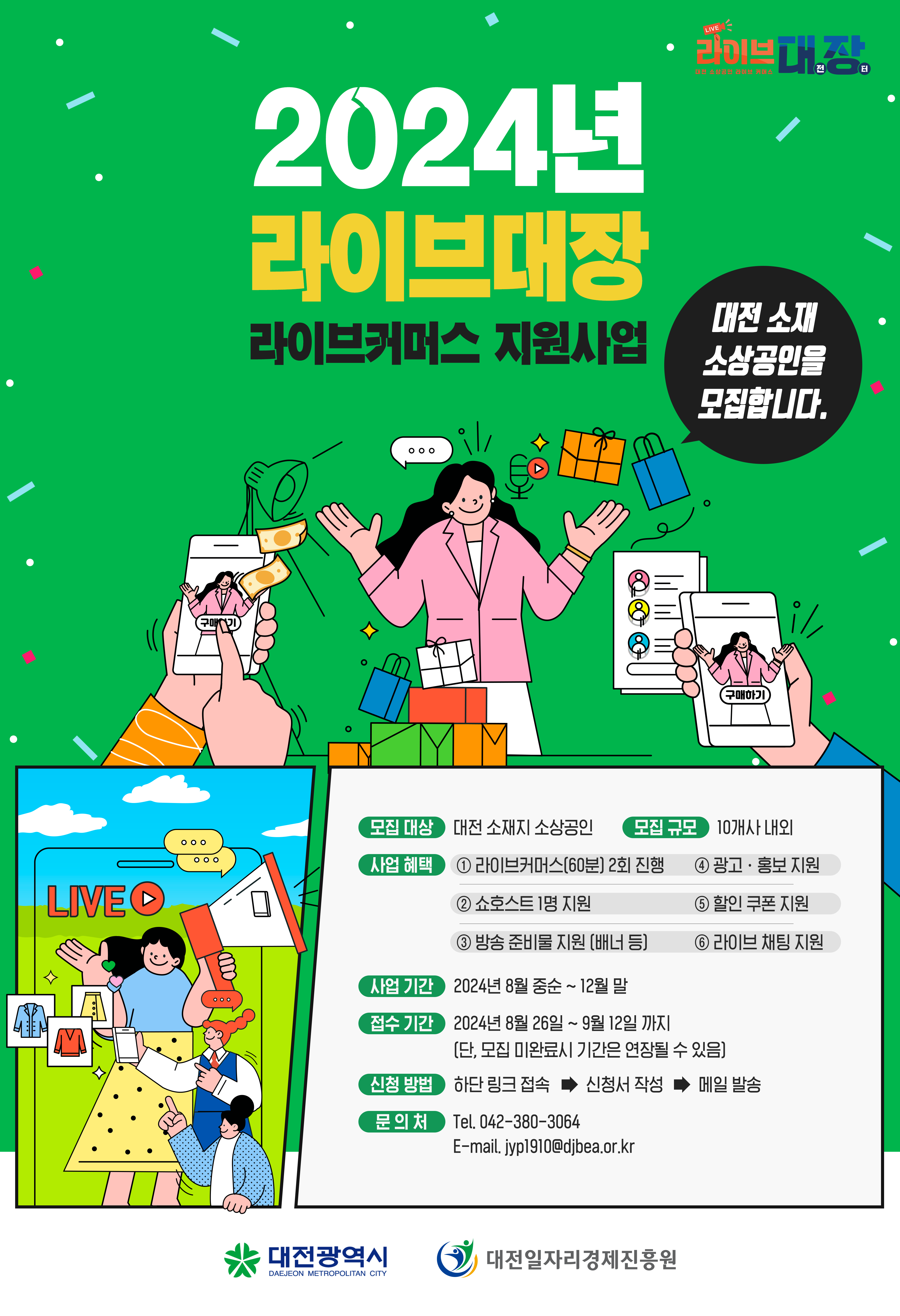 안녕하세요. 현재 대전일자리경제진흥원에서 소상공인 온라인 판로지원 - 라이브커머스 지원 사업에 참여할 소상공인을 모집 중에 있습니다. 평소에 네이버 쇼핑라이브에 도전 해보고 싶으셨는데 방법을 잘 모르셨거나 어려움을 느끼고 계셨던 대전시 소재의 스마트스토어 셀러 분들이 계시다면 이번 기회에 지원 받아보시기 바랍니다.
