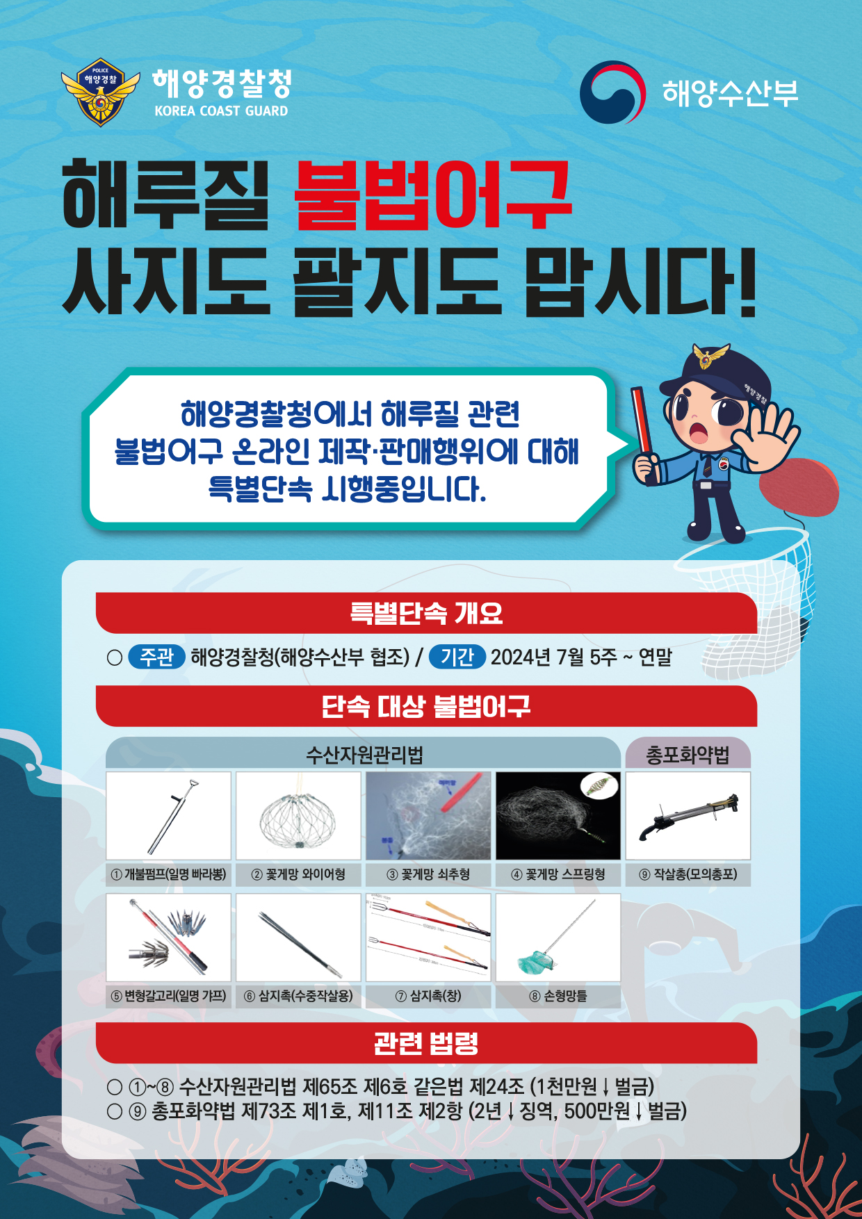 안녕하세요. 최근 해양경찰청에서 해루질 관련 불법 어구 온라인 제작 판매행위에 대하여 특별 단속 시행중입니다.