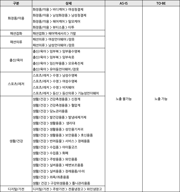 (표1) 노출 불가 → 노출 가능 카테고리로 변경된 항목