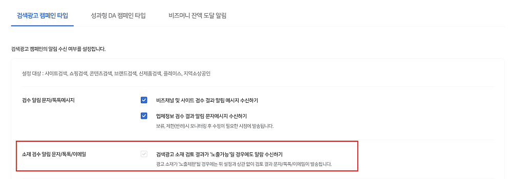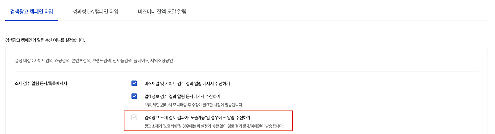 ■ 변경 사항 - 검색광고 캠페인 알림 설정 항목 중 “소재 검수 알림 문자/톡톡 메시지”의 “검색광고 소재 검토 결과가 ‘노출 가능’일 경우에도 알림 수신하기” 항목