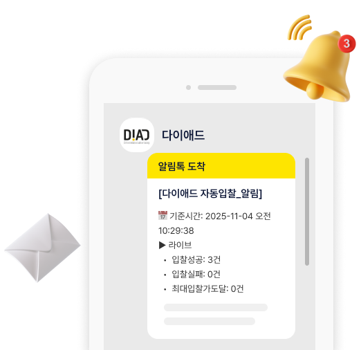 매 순간 입찰을 모니터링하지 않아도 됩니다. 메일과 카카오 알림톡을 통해 입찰정보 알림을 보내 드립니다. 광고 상태 변화에 신속한 대응과 효율적인 관리가 가능합니다.