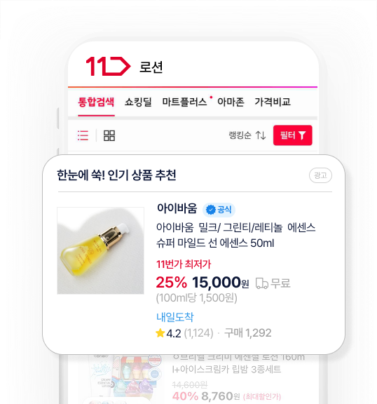 - 11번가의 검색 결과 페이지 및 추천 영역 등 다양한 주목도 높은 광고 영역에 판매 상품을 노출