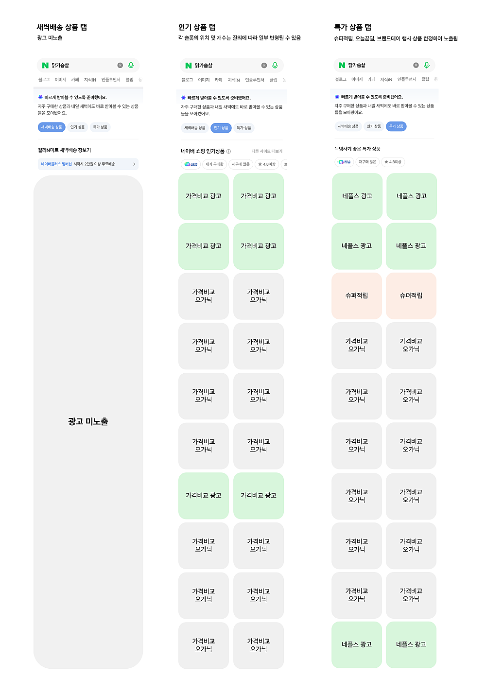 <식품> 가격비교, 네이버플러스 스토어 2개 컬렉션을 단일 컬렉션으로 통합하여 노출 - 탭 별 노출 방식 - 새벽배송 상품 탭 : 광고 미노출 - 인기 상품 탭 : 가격비교 광고 & 맞춤형 블록 광고 노출 - 가격비교 광고, 가격비교 오가닉, 맞춤형 슬롯의 위치 및 개수는 질의에 따라 일부 변형될 수 있음 - 특가 상품 탭 : 네이버플러스 스토어 광고 상품 중 슈퍼적립, 오늘끝딜, 브랜드데이 행사 상품에 해당할 경우에만 노출