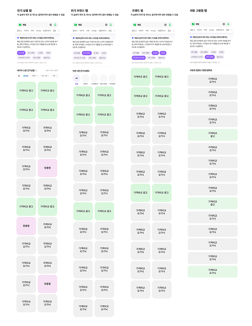 <패션> 가격비교, 네이버플러스 스토어, 맞춤형 블록 3개 컬렉션을 단일 컬렉션으로 통합하여 노출 - 탭 별 노출 방식 - 인기 상품 탭 : 일부 트래픽에 대해 가격비교 & 맞춤형 블록 광고 통합 노출 - 가격비교 광고, 가격비교 오가닉, 맞춤형 슬롯의 위치 및 개수는 질의에 따라 일부 변형될 수 있음 - 인기 브랜드 탭 : 관련 인기 브랜드에 대해 탭 노출하며 해당 탭 내 가격비교 광고 노출 - 트렌드 탭: 관련 트렌드 질의에 대해 탭 노출하며 해당 탭 내 가격비교 광고 노출 - 리뷰 고평점 탭 : 가격비교 광고 노출 - 클립 pick : 광고 미노출