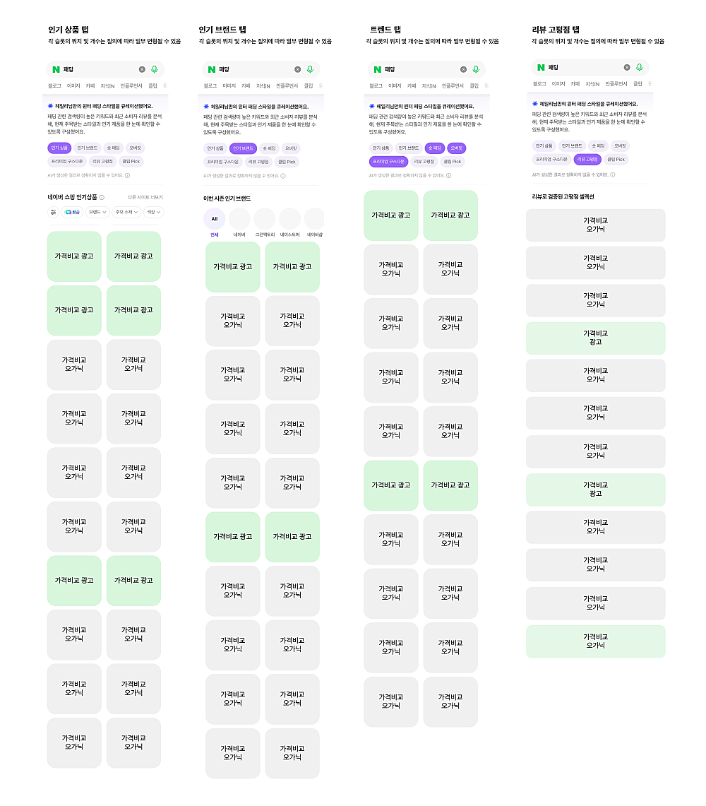 ■ 적용 상세 가격비교, 네이버플러스 스토어 2개 컬렉션을 단일 컬렉션으로 통합하여 노출 맞춤형 컬렉션 노출 여부에 따라 가격비교 내 상품 개수 변동 가능 - 탭 별 노출 방식 - 인기 상품 탭 : 질의 관련 인기 상품에 대해 가격비교 광고 노출 - 인기 브랜드 탭 : 관련 인기 브랜드에 대해 탭 노출하며 해당 탭 내 가격비교 광고 노출 - 트렌드 탭 : 관련 트렌드 질의에 대해 탭 노출하며 해당 탭 내 가격비교 광고 노출 - 리뷰 고평점 탭 : 가격비교 광고 노출 - 클립 pick : 광고 미노출