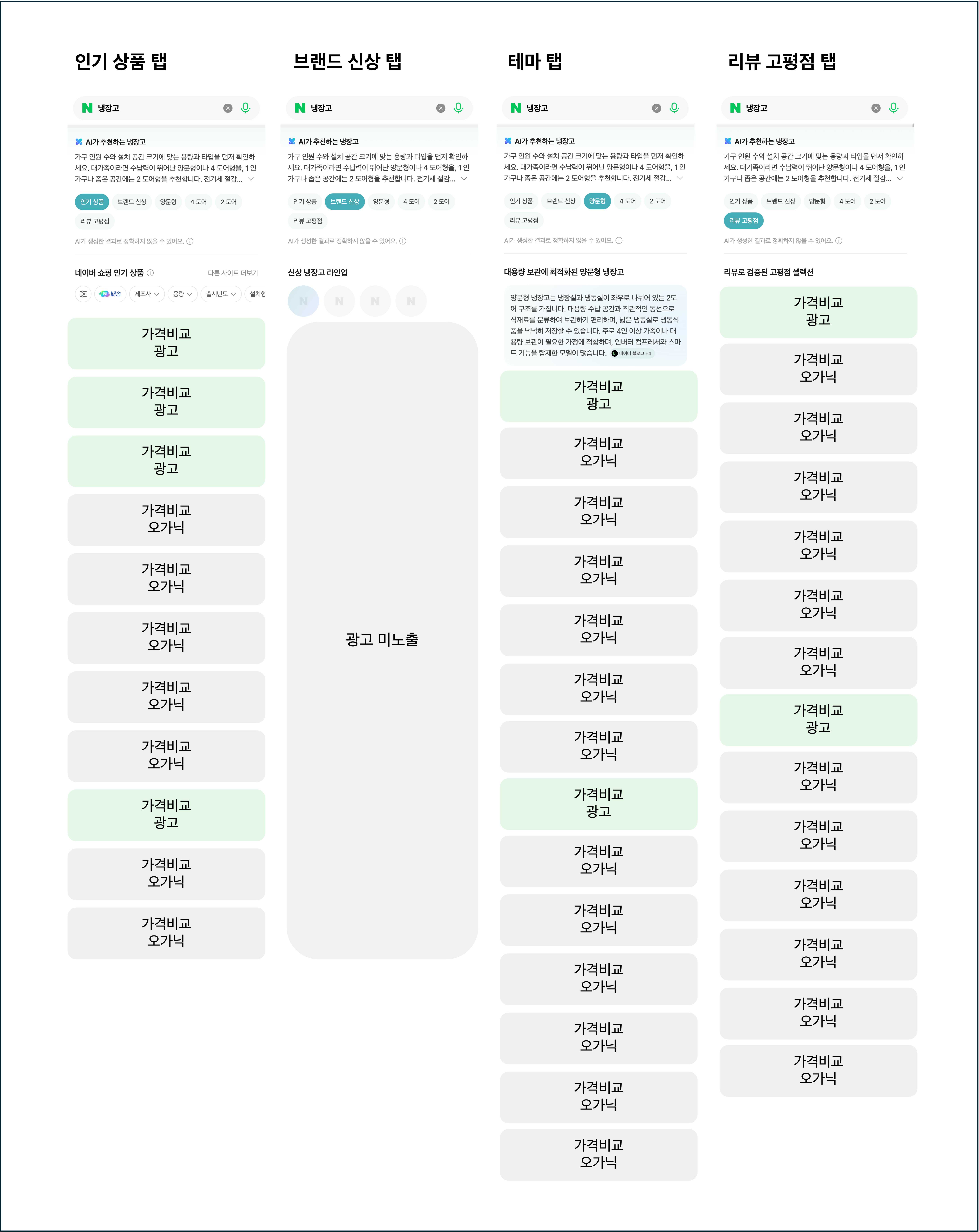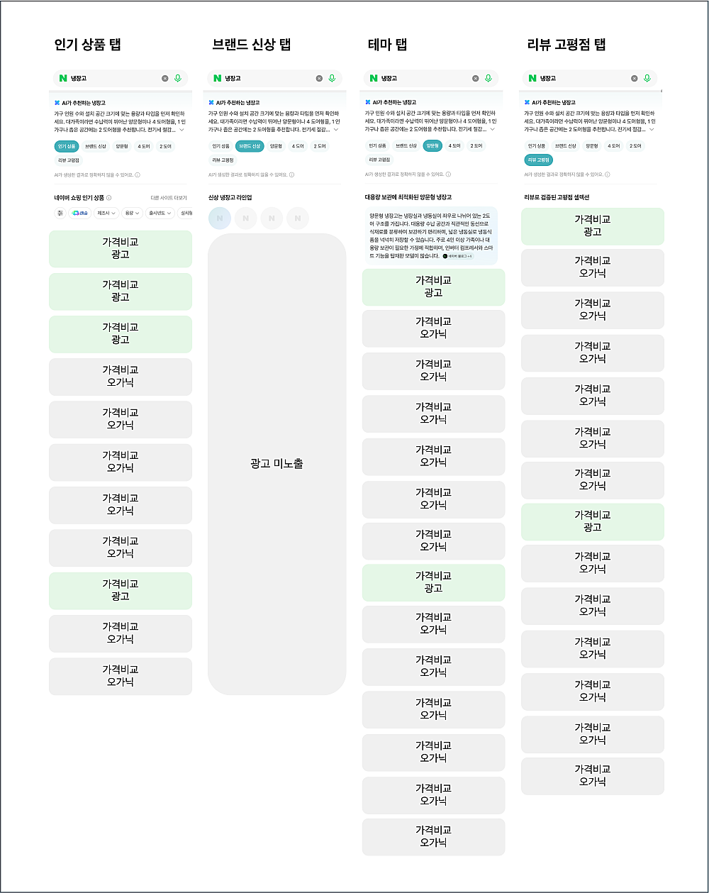 <탭 별 노출 방식> - 인기 상품 탭 : 해당 탭은 최대 3페이지까지 노출하며 탭 내 가격비교 광고 노출 - 브랜드 신상 탭 : 광고 미노출 - 트렌드 테마 탭 : 관련 트렌드 질의에 대해 탭 노출하며 해당 탭 내 가격비교 광고 노출 - 리뷰 고평점 탭 : 가격비교 광고 노출