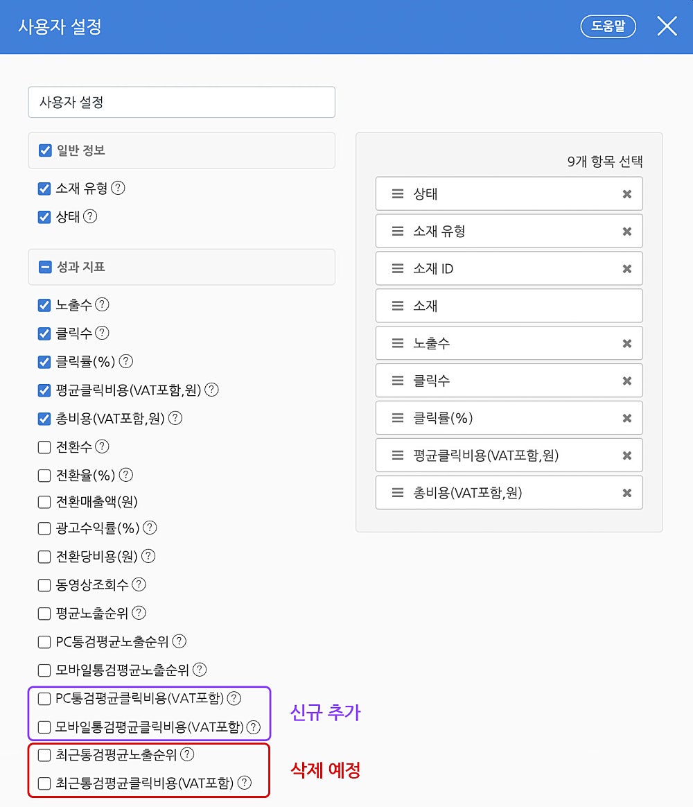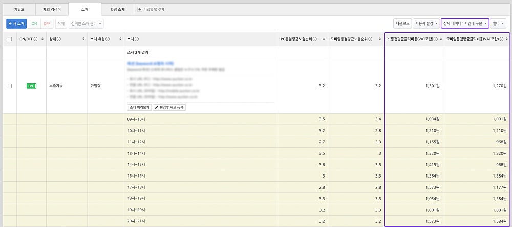 - 또한, 시간대별로는 '상세데이터 : 시간대 구분'을 통해 확인하실 수 있습니다. ![]() ※ 알아두세요! - 기존에 제공되던 최근통검평균노출순위, 최근통검평균클릭비용은 PC/모바일통검평균노출순위, PC/모바일통검평균클릭비용으로 대체되기 때문에 배포일로부터 제공이 종료됩니다. - 신규지표는 배포일로부터 신규 생성되기 때문에 배포일 이전 성과는 존재하지 않습니다.
