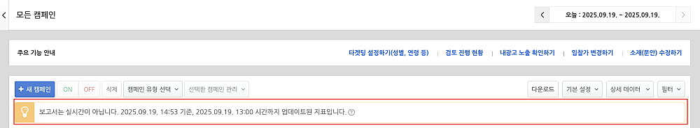 - 광고시스템 내 ‘광고관리’에서 제공되는 지표의 ‘오늘’ 성과는 실시간이며, 20분 이내로 제공됩니다. 또한, 기존에는 오늘과 이전 기간을 함께 선택할 수 없었지만 변경 이후로는 함께 선택하실 수 있습니다.