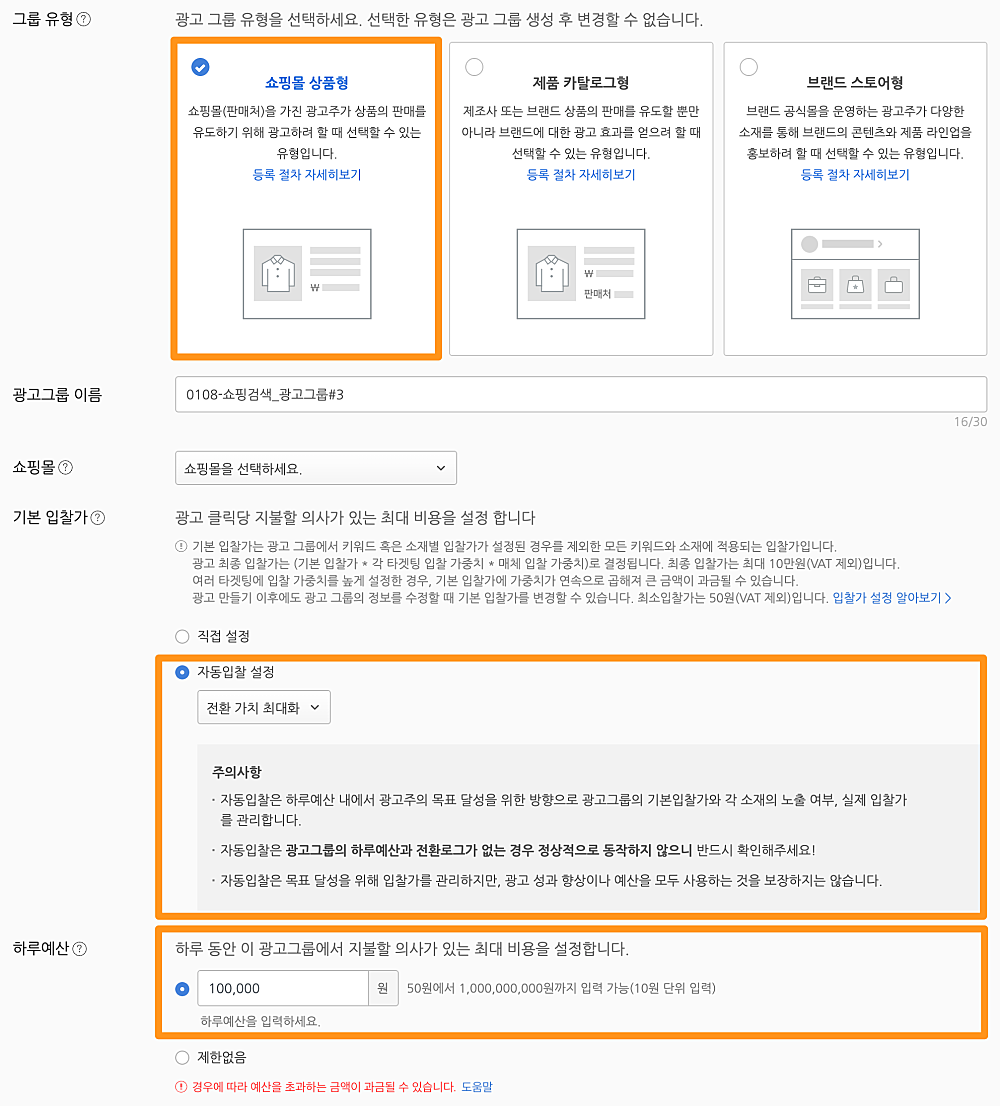 ■ 설정 방법 : 1. 광고그룹 유형으로 쇼핑몰 상품형을 선택합니다. 2. 기본 입찰가 항목에서 자동입찰을 설정합니다. 3. 하루 예산을 설정합니다. ![]() ※ 주의하세요! - 자동입찰은 광고그룹의 하루예산과 전환로그가 없는 경우 정상적으로 동작하지 않으니 반드시 확인해 주세요! - 자동입찰은 목표 달성을 위해 입찰가를 관리하지만, 광고 성과 향상이나 예산을 모두 사용하는 것을 보장하지는 않습니다.