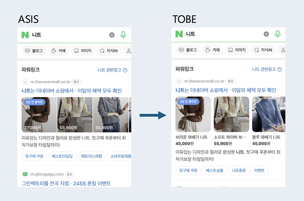 안녕하세요. 비즈니스 시작과 성공을 함께하는 e-커머스 파트너 가비아CNS입니다. 일부 트래픽을 대상으로 한 '쇼핑정보' 확장소재 노출 테스트에 이어 (관련 공지), 사이트검색광고의 '쇼핑정보' 확장소재의 노출형상이 변경될 예정입니다. 상품 정보를 추가 노출하여 광고의 주목도를 높이기 위해, 상품 이미지 하단에 상품명이 함께 노출됩니다.
