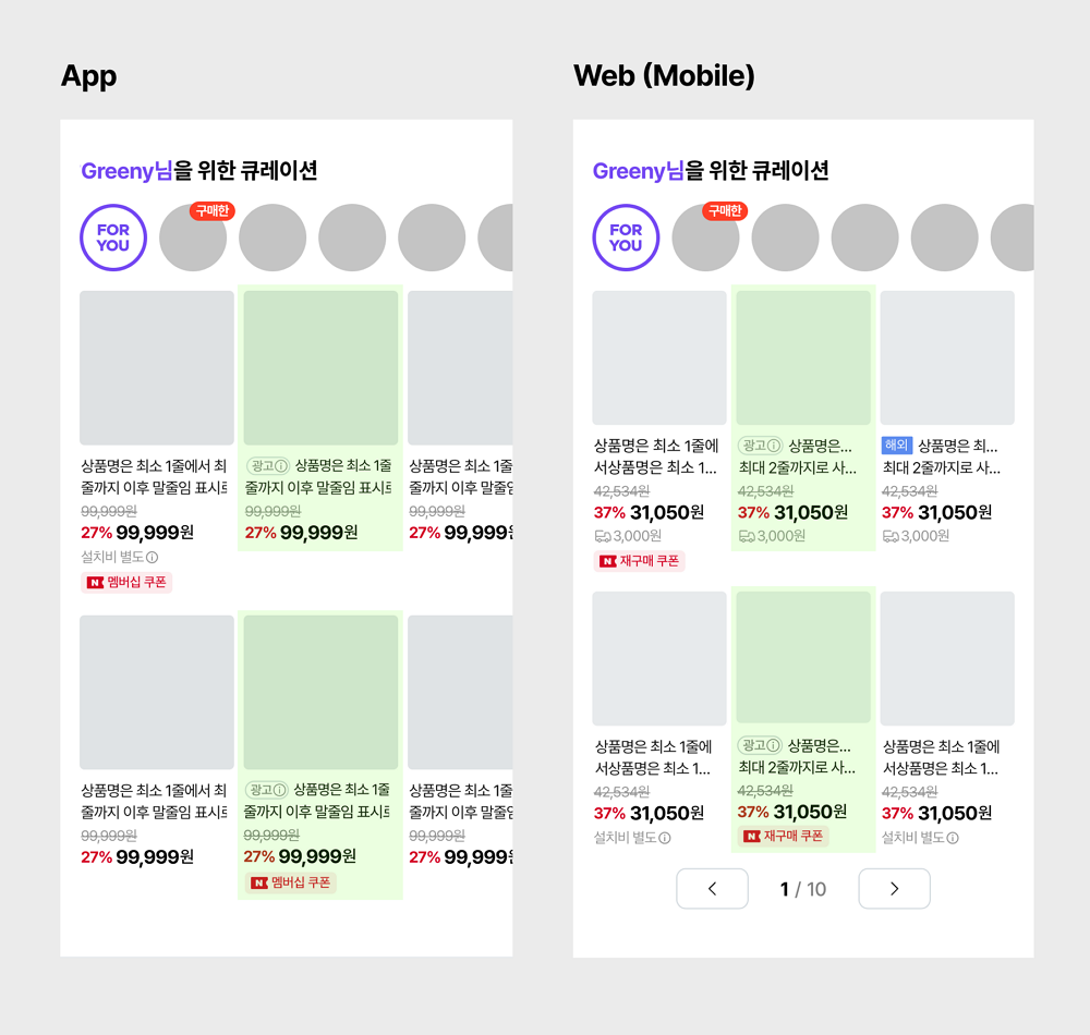 ■ 적용 지면 - 네이버플러스 스토어 홈 “OO님을 위한 큐레이션” 영역 (FOR YOU 탭)